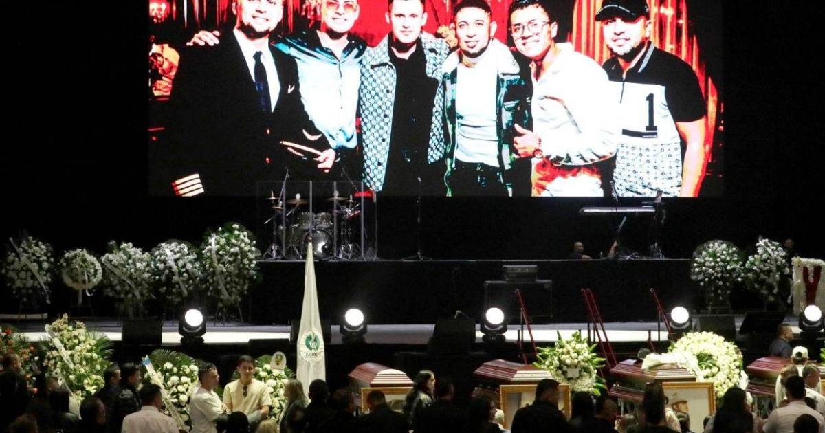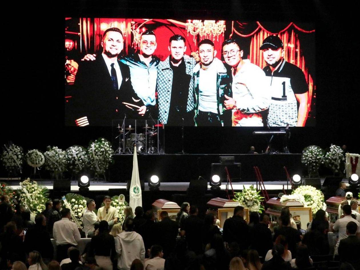 En la primera línea, alineados frente al público y al escenario estaban los féretros con la foto de Jiménez y de las otras cinco personas que murieron en el accidente, cubiertos de arreglos florales y custodiados por familiares, allegados y personal de logística.