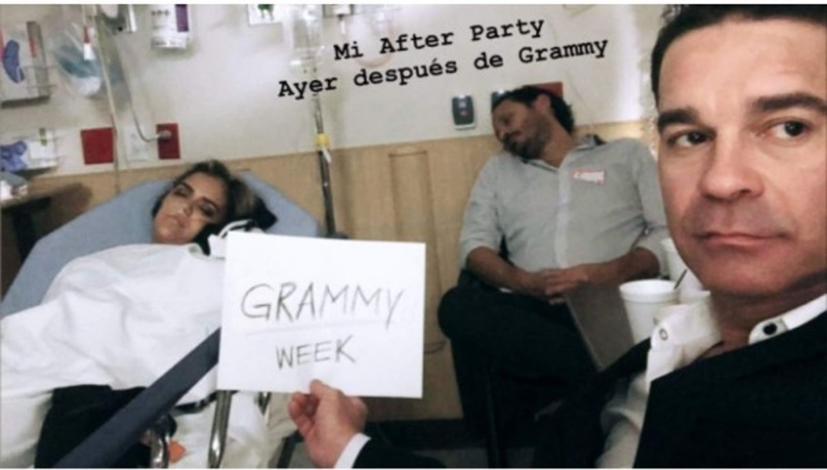 En la imagen se le ve acostada sobre una camilla, recibiendo oxígeno. 'Semana de Grammy' dice una nota que sostiene un joven que la está acompañando en la sala de urgencias.