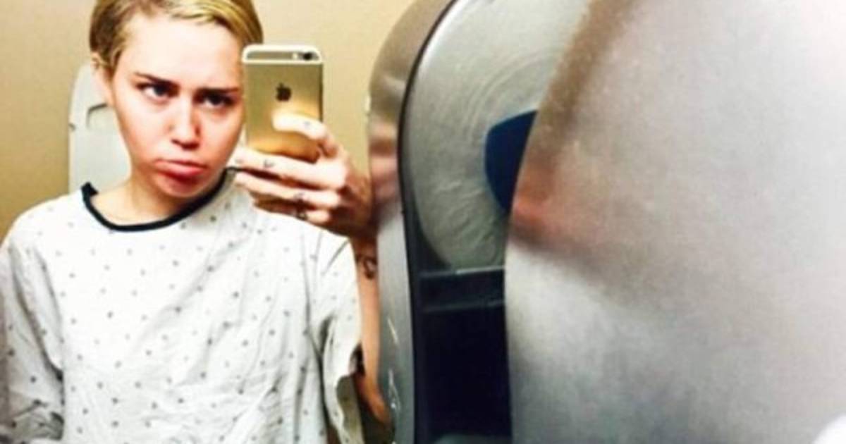 Además de la fotografía de su herida, Miley Cyrus también publicó una de ella antes de ser atendida, usando una bata de paciente y posando con una cara bastante triste.