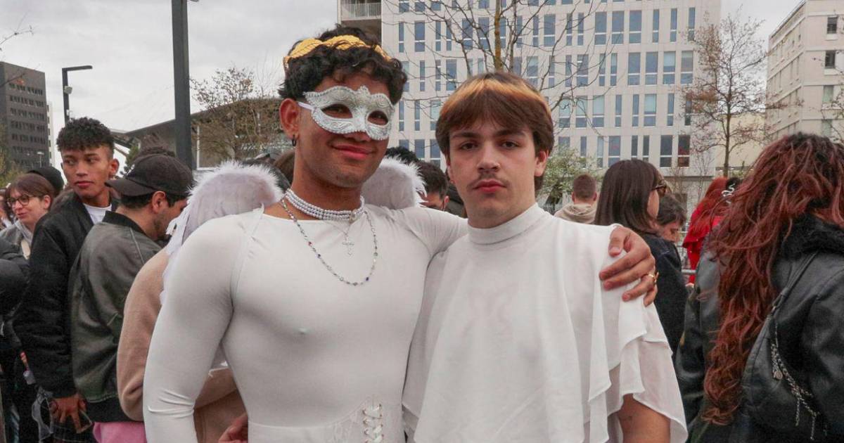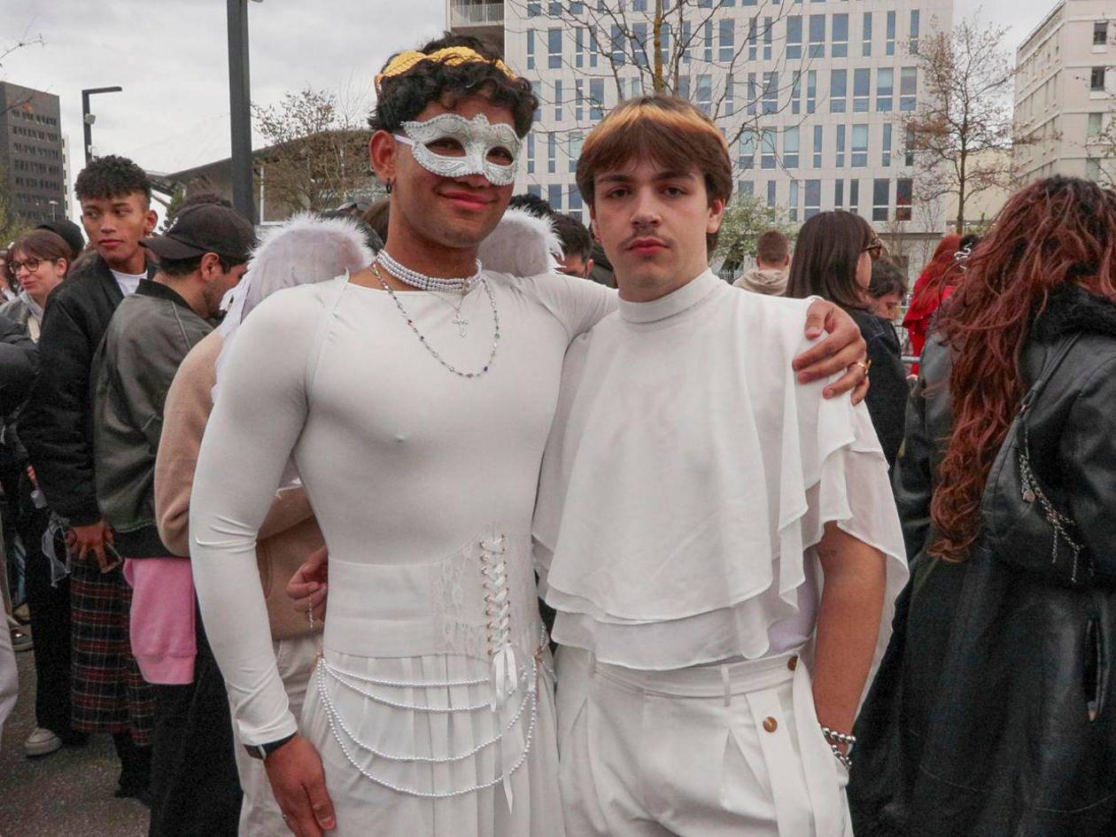 De ángeles directamente se vistieron Íker, estudiante gallego de 21 años, y Kelian, francés de 22, situados en los primeros puestos de la cola, justo al lado de la tienda de productos oficiales de la gira, en la que el elemento que más llamaba la atención era una sudadera con capucha larga en forma de pico -similar al velo de una monja-, por delante de las camisetas con la leyenda 'Red flag andante'.