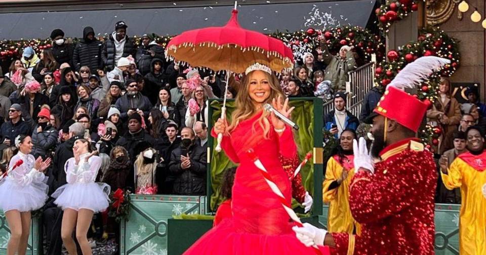 Con un espectacular vestido rojo de tul y con una sombrilla del mismo tono, Mariah emocionó a los neoyorquinos quienes aman la festividad.
