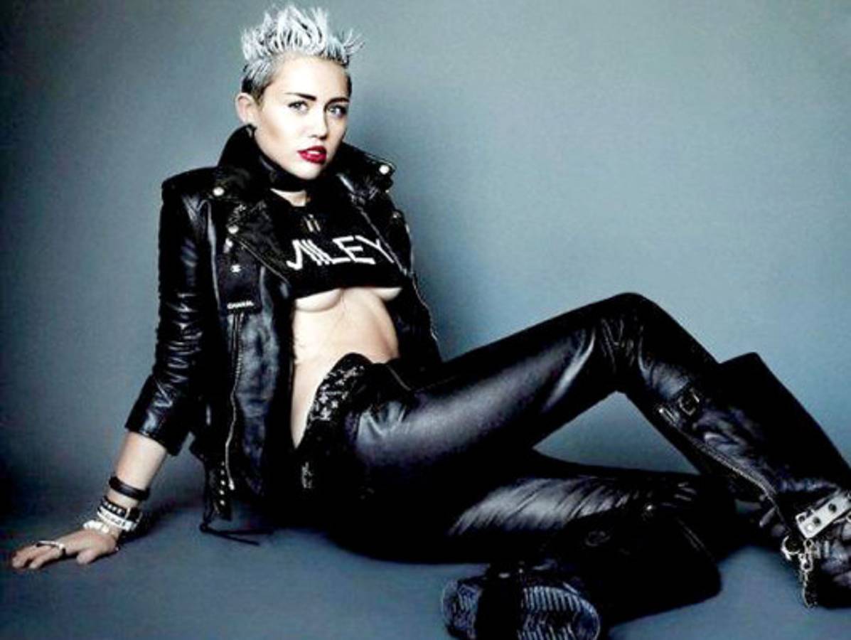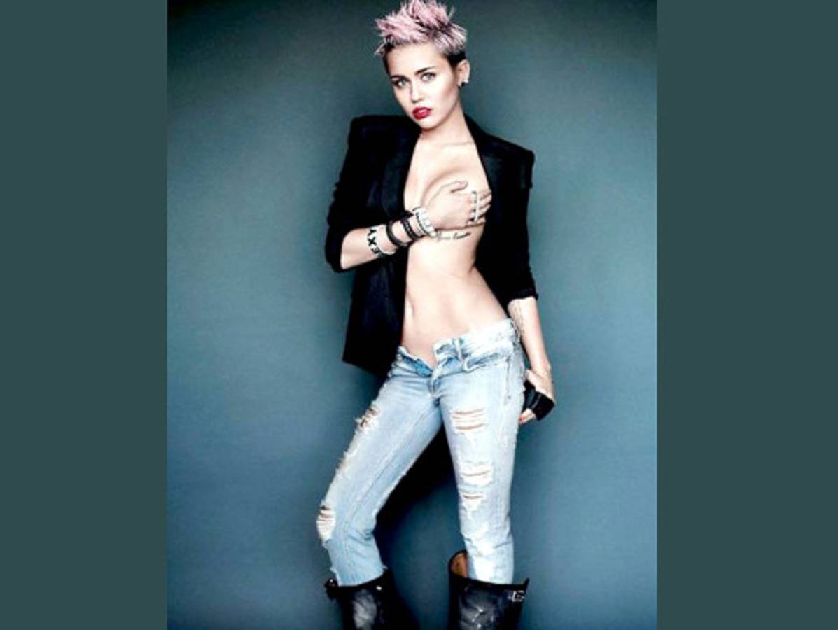 En ellas, la cantante deja poco a la imaginación y se lo quita casi todo.Con el pelo corto y de color morado, Cyrus se atreve con todo. Posa sexy en ropa interior y sin ella, insinuando y dejando ver partes de su escultural cuerpo.