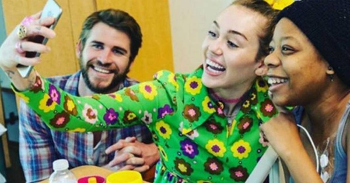 Miley fue la encargada de compartir en sus redes sociales varias fotografías interactuando con los pacientes durante su visita al centro médico, al que acudió con un excéntrico atuendo compuesto por una camisa verde de flores y una chaqueta rosa tipo peluche.