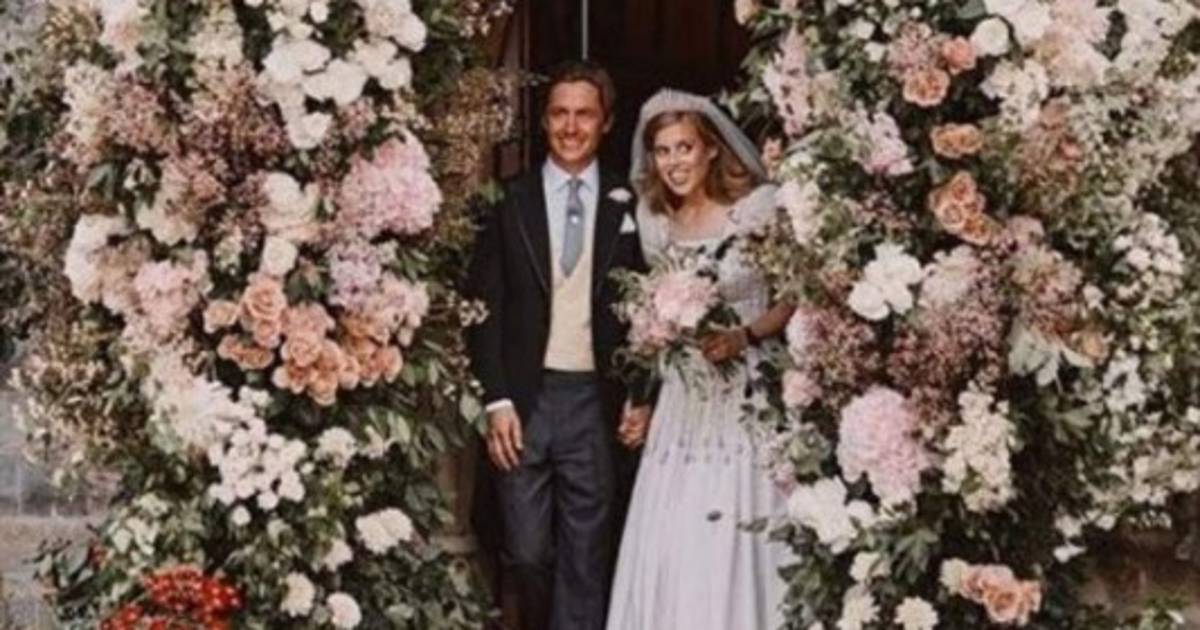 La princesa Beatriz llevaba un vestido vintage de Norman Hartnell y la tiara de flecos de diamantes de la reina María, ambas pertenecientes a su abuela. Su majestad la reina usó la tiara el día de su boda en 1947.
