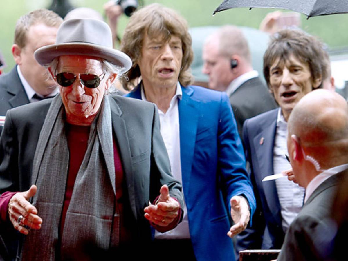 Mick Jagger y Keith Richards, que a sus 68 años son los dos miembros fundadores que sobreviven en el grupo actual, llegaron acompañados de Charlie Watts y Ronnie Wood a Somerset House, donde decenas de aficionados les esperaron pacientemente bajo la lluvia.