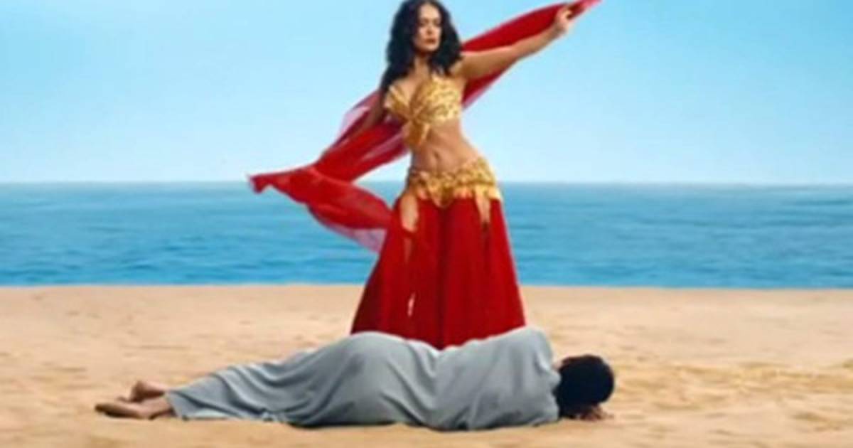 La actriz mexicana aparece vestida con un atuendo árabe y hace sexys movimientos en la playa y ante un hombre recostado sobre la arena.