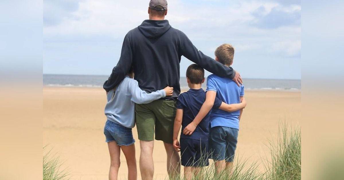 Los niños están abrazando a su padre mientras miran juntos al horizonte, reflejando un momento de amor.