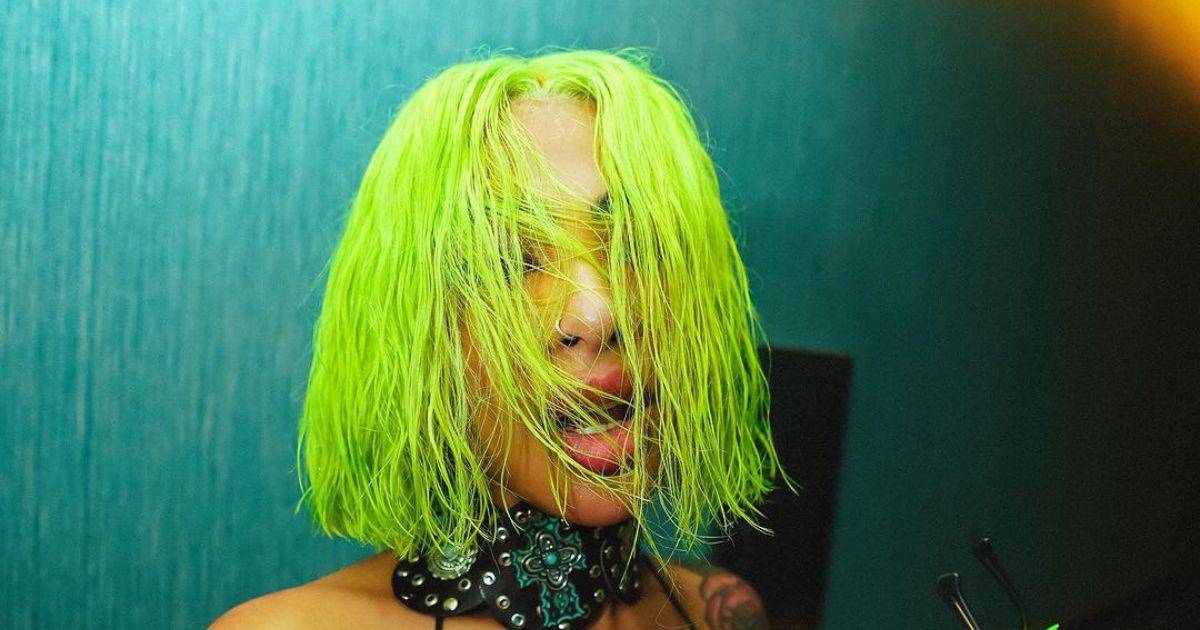 Yailin, que durante el proceso cerró sus perfiles, reapareció luciendo un sexy y atrevido atuendo oscuro dejando al descubierto su espectacular figura. Además luce una cabellera color verde fluorescente que hace juego con sus uñas y lentes.