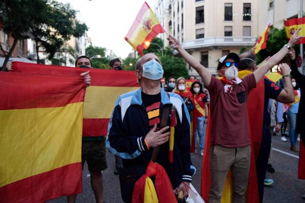 En muchos países los habitantes se han pronunciado en contra de la gestión de la crisis sanitaria por parte de los gobiernos. En España, este 18 de mayo la gente ondea banderas y golpea ollas durante una protesta contra el gobierno por su gestión, frente a la sede del Partido Socialista en Madrid, a pesar de un bloqueo nacional para evitar la propagación de la enfermedad Covid-19. Fotos: AFP/AP 18/05/2020 - 00:006 / 20 -