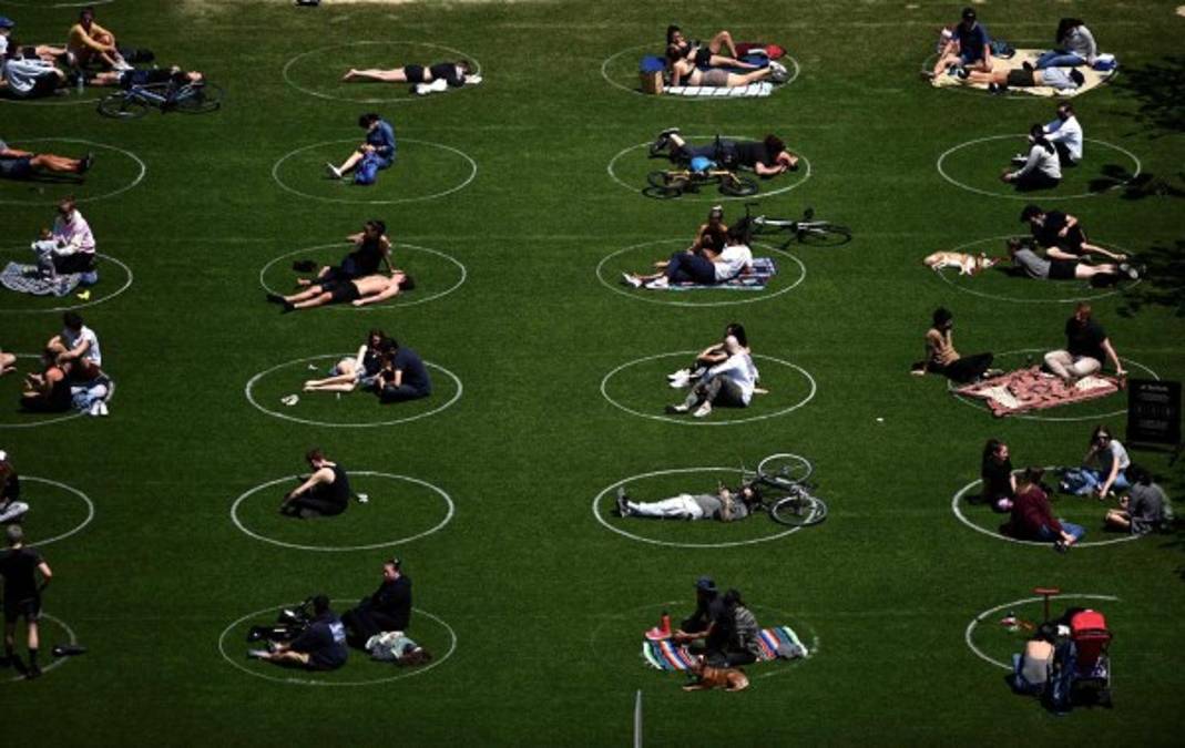 En Nueva York, donde con la disminución de casos se han levantado algunas restricciones, las personas se sientan en círculos destinados a alentar el distanciamiento social en Domino Park a lo largo del East River el 18 de mayo de 2020. A medida que aumentan las temperaturas, más neoyorquinos se dirigen a los parques y las calles. Fotos: AFP/AP 18/05/2020 - 00:0010 / 20 -