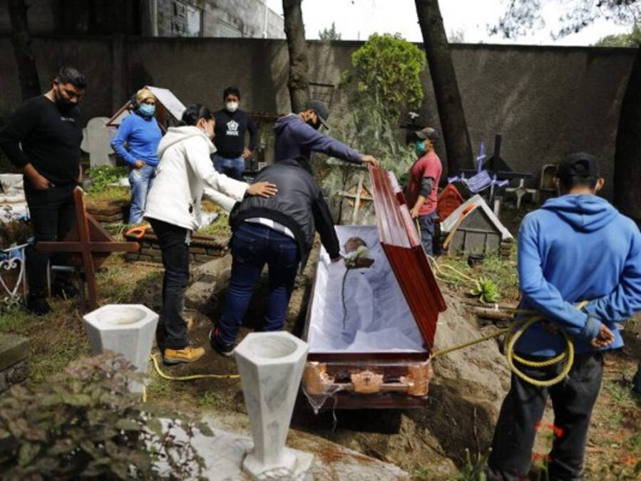 Familiares se despiden de un hombre de 63 años que murió de un ataque cardíaco, que su familia dijo que no tenía relación con el covid-19, en el cementerio Xilotepec en Xochimilco, Ciudad de México. 02/08/2020 - 00:0012 / 16 -