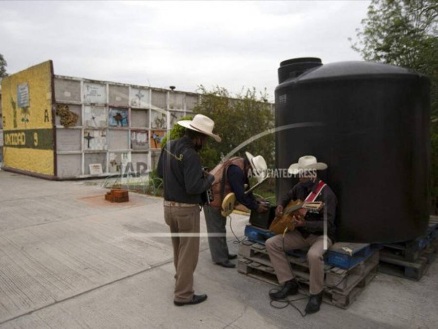 Un trío de músicos con mascarillas para protegerse del coronavirus espera clientes en el cementerio municipal de Nezahualcáyotl, cerca de la Ciudad de México.