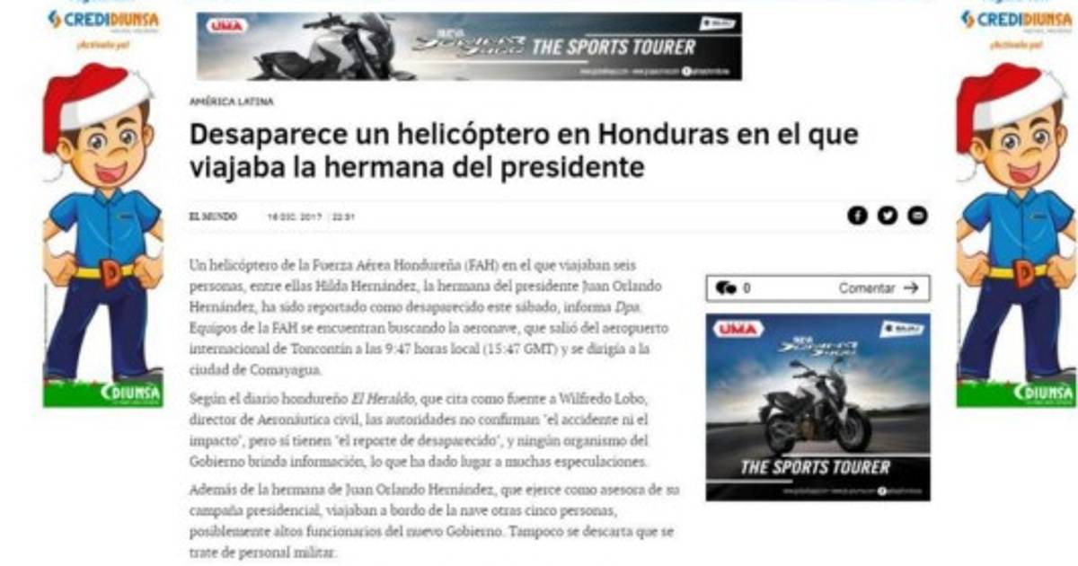 El Nuevo Diario de Nicaragua tituló la nota: 'Desaparece helicóptero en el que viajaba hermana del presidente de Honduras'. 16/12/2017 - 00:007 / 9 -