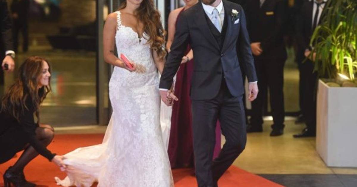 Roccuzzo, de 29 años, amiga del capitán de la selección argentina desde que ella tenía 8 años, y madre de sus dos hijos Thiago (4) y Mateo (1) eligió un traje exclusivo de la diseñadora catalana Rosa Clará, corte sirena, con sugerente y profundo escote en forma de corazón acompañado por tirantes de encaje. 30/06/2017 - 00:006 / 16 -