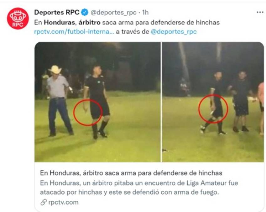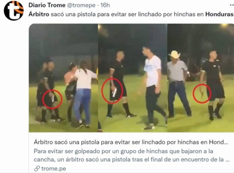 La noticia de un árbitro que sacó su pistola para defenderse de los reclamos de jugadores y aficionados en el municipio de La Jigua, Copán, sin duda alguna generó mucho impacto a nivel nacional, pero el video le ha dado la vuelta al mundo y diferentes medios internacionales destacan el hecho ocurrido en una cancha de fútbol e incluso llegaron a catalogarlo como una 'barbaridad'. 18/08/2021 - 00:001 / 17 -