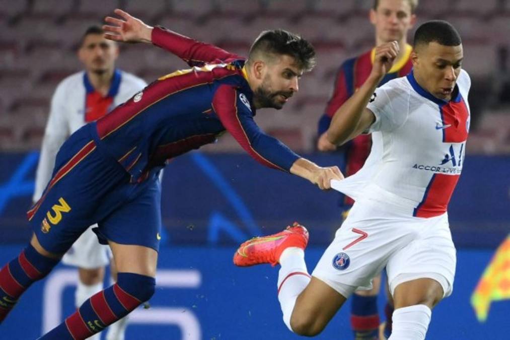 El defensa español del Barcelona, Gerard Piqué, desafía al delantero francés del Paris Saint-Germain, Kylian Mbappé en el partido de ida y al no poder detenerlo, simplemente lo hala de la camisa. 16/02/2021 - 00:0010 / 16 -
