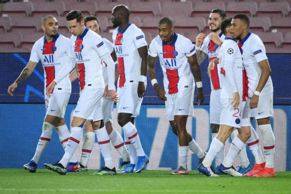 Paris Saint-Germain's French forward Kylian Mbappe (R) celebrates with teammates after scoring his team's fourth goal during the UEFA Champions League round of 16 first leg football match between FC Barcelona and Paris Saint-Germain FC at the Camp Nou stadium in Barcelona on February 16, 2021. (Photo by LLUIS GENE / AFP) 16/02/2021 - 00:0015 / 16 -