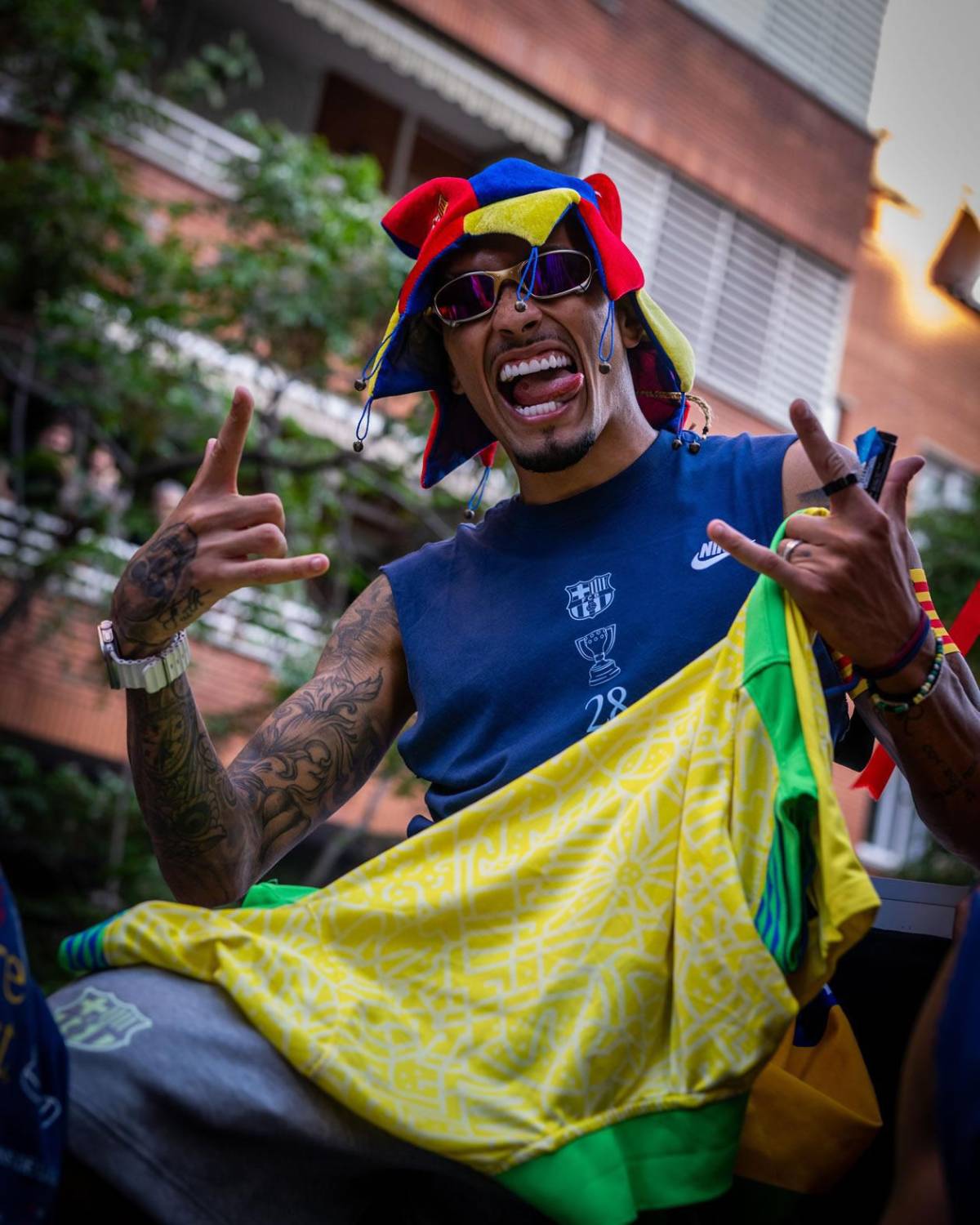 Los jugadores del Barcelona subieron al autobús una balón de playa, recordando el cántico que dedican a Vinicius y se burlaron del brasileño en la rúa. Pedri levantó la pelota ante los aficionados culés.