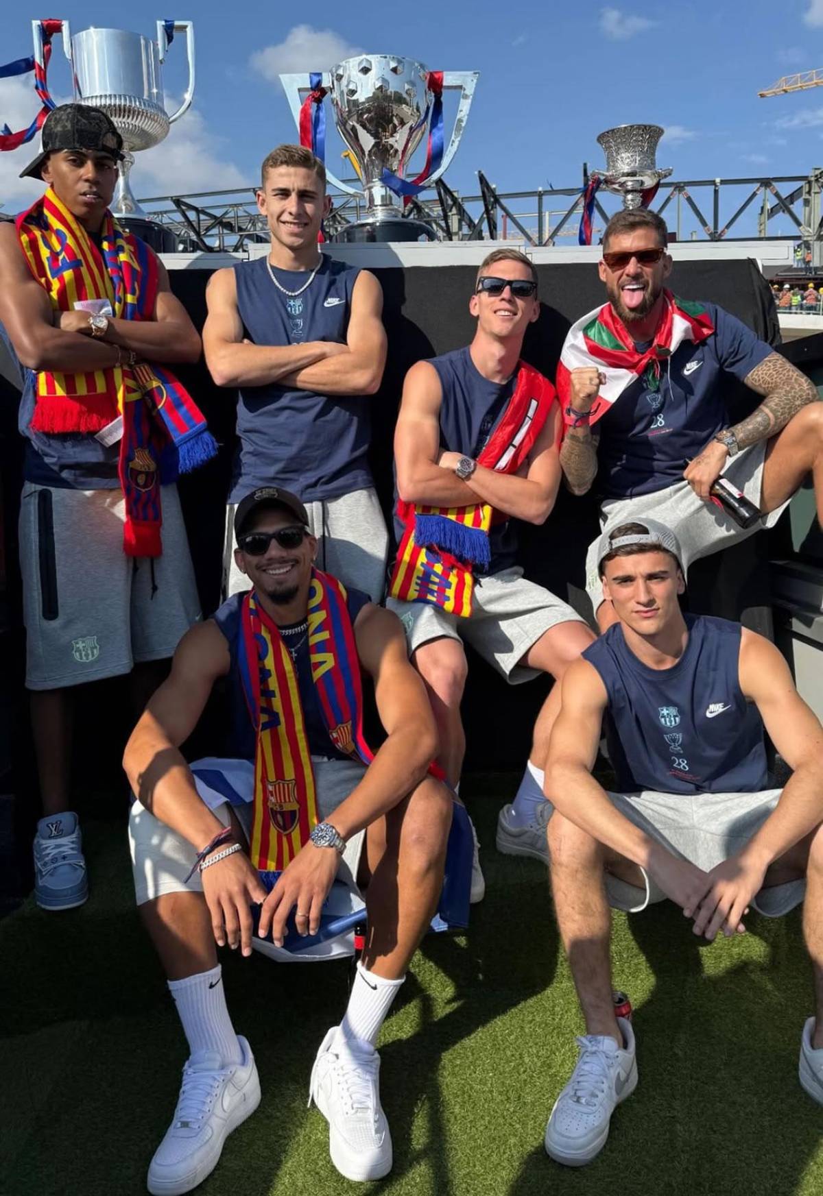 Lamine Yamal, Fermín López, Dani Olmo, Iñigo Martínez, Ronald Araújo y Gavi posando con los trofeos de fondo en el autobús.