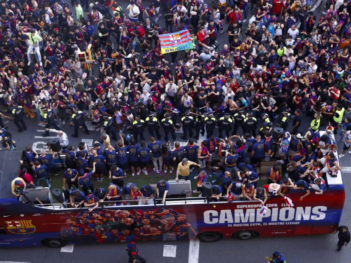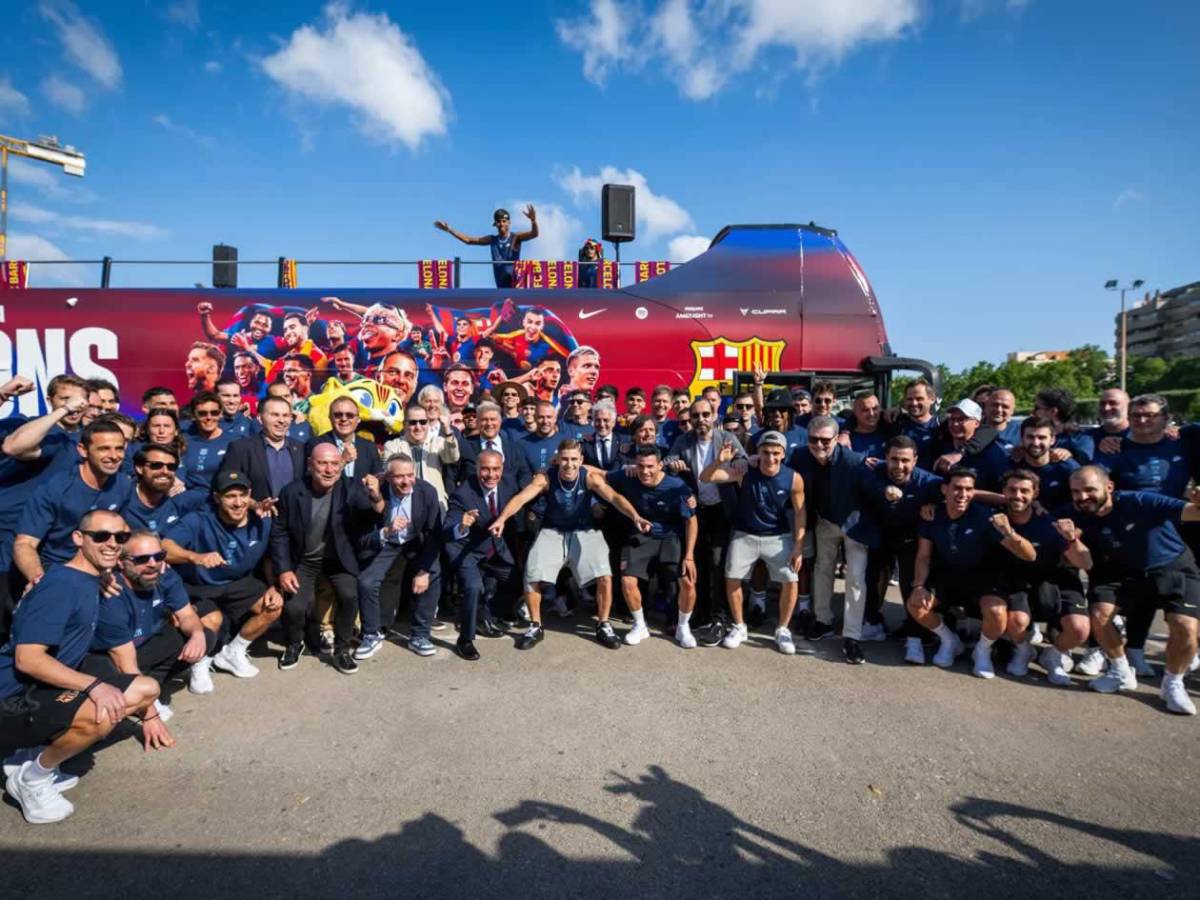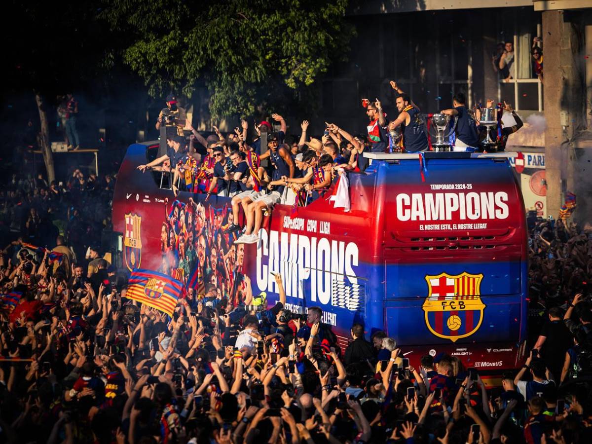 En un autobús descapotable teñido de azulgrana, con la cara impresa de todos los jugadores en los laterales y la leyenda en el frontal 'Campions: el nostre estil, el nostre llegat' ('Campeones: nuestro estilo, nuestro legado'), plantilla y cuerpo técnico han iniciado su viaje de homenaje custodiando los tres trofeos conquistados esta campaña.