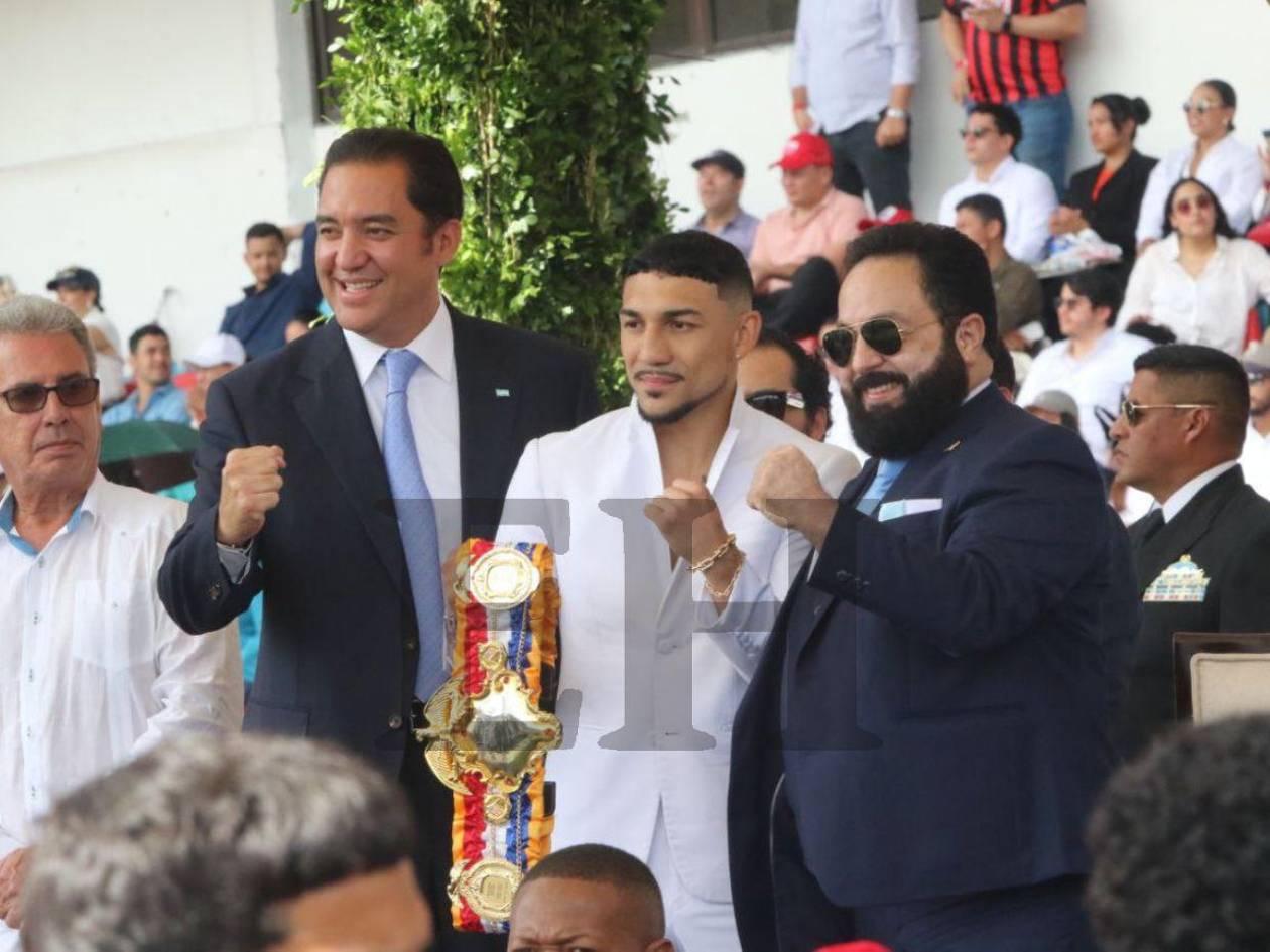 Luciendo un look totalmente blanco, el boxeador subió a saludar a la presidenta de la República, Xiomara Castro.
