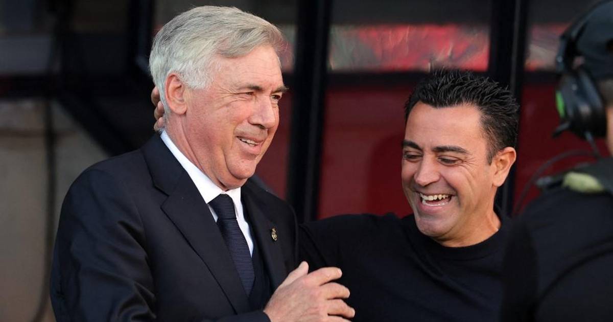 El entrenador italiano del Real Madrid, Carlo Ancelotti, y el técnico español del Barcelona, Xavi, se saludan antes del partido del clásico entre Barcelona y el Real Madrid, previo a que los equipos luchen en la grama.