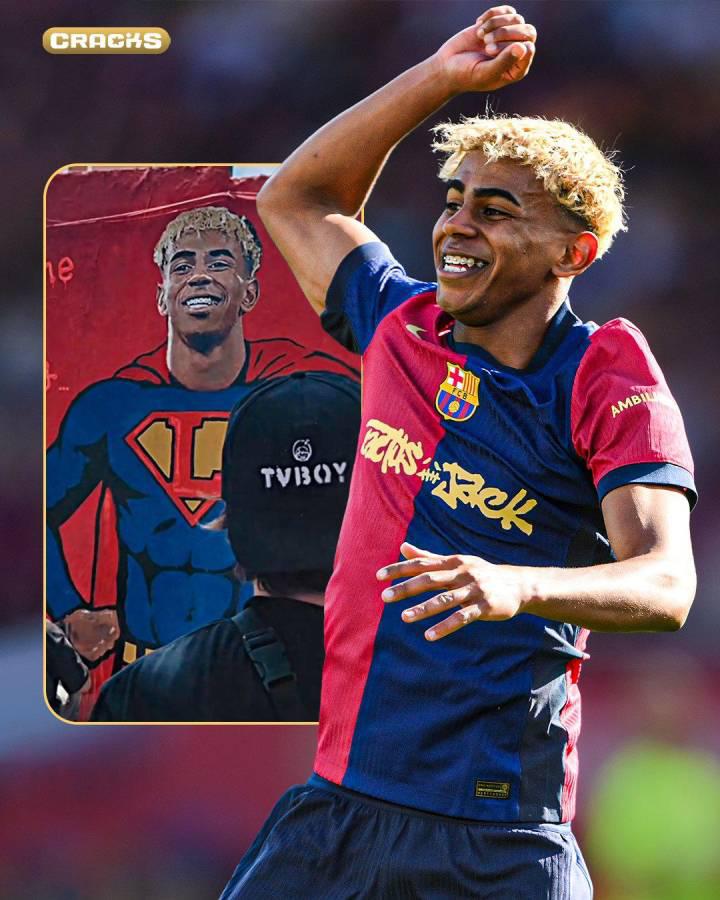 El delantero del Barcelona Lamine Yamal, que este domingo 13 de julio cumplió 18 años, ha sido retratado como un superhéroe en un mural del artista urbano TVBoy, que lo largo de su trayectoria ha reproducido en sus grafitis por las calles de Barcelona a Leo Messi, Alexia Putellas o Rosalía, entre otros.