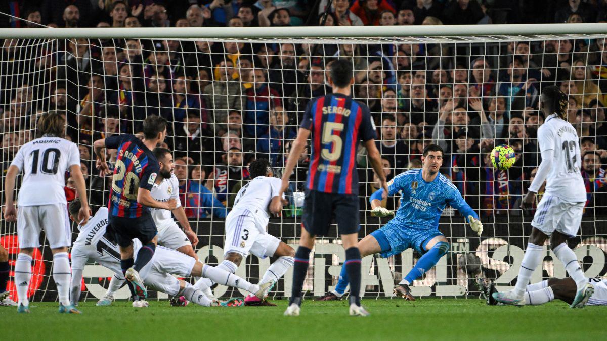 Real Madrid y Barcelona disputan un épico encuentro en el Camp Nou que podría definir la Liga Española. Los blancos se pusieron por delante en el marcador gracias a un autogol de Ronald Araujo y el conjunto Blaugrana empató con un gol de Sergi Roberto.