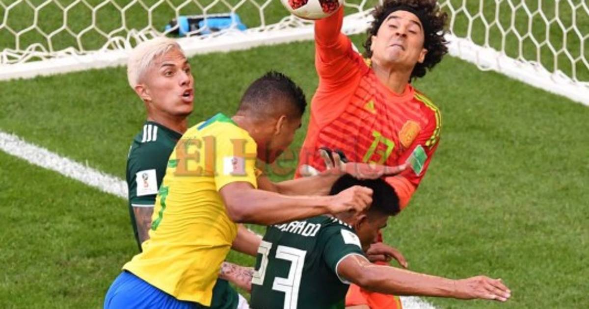 El guardameta mexicano Guillermo Ochoa golpea el balón por delante del centrocampista brasileño Casemiro. 02/07/2018 - 00:007 / 11 -