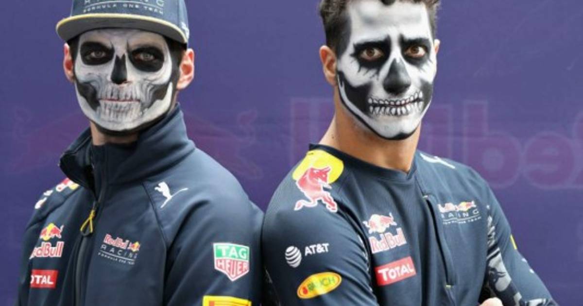 Los pilotos de Red Bull F1, Daniel Ricciardo y Max Verstappen llegaron este día a las pruebas del Gran Premio de México de este fin de semana pintados con la cara del Catrín, en honor al Día de los Muertos en México. Fotos: Agencia AFP.