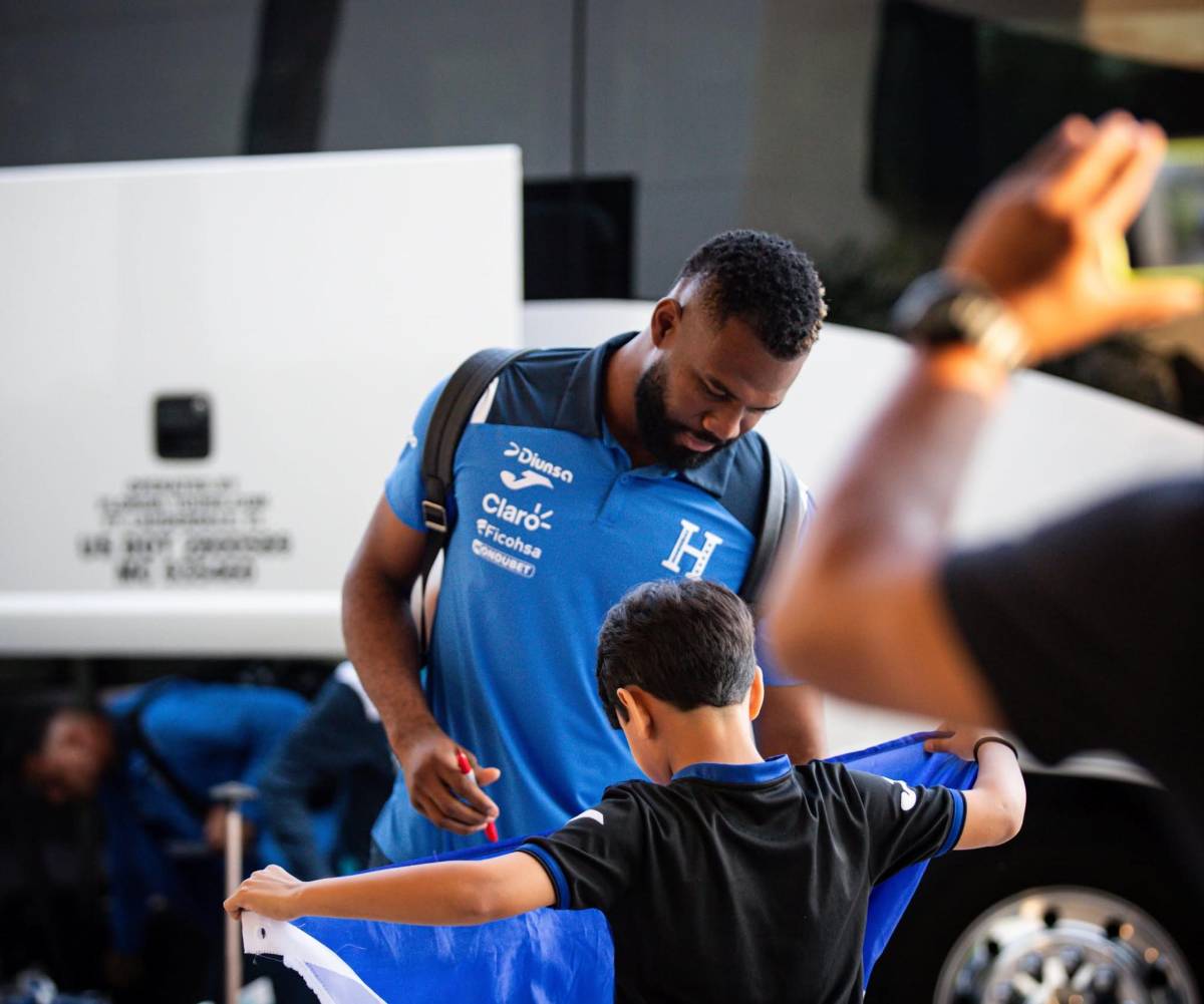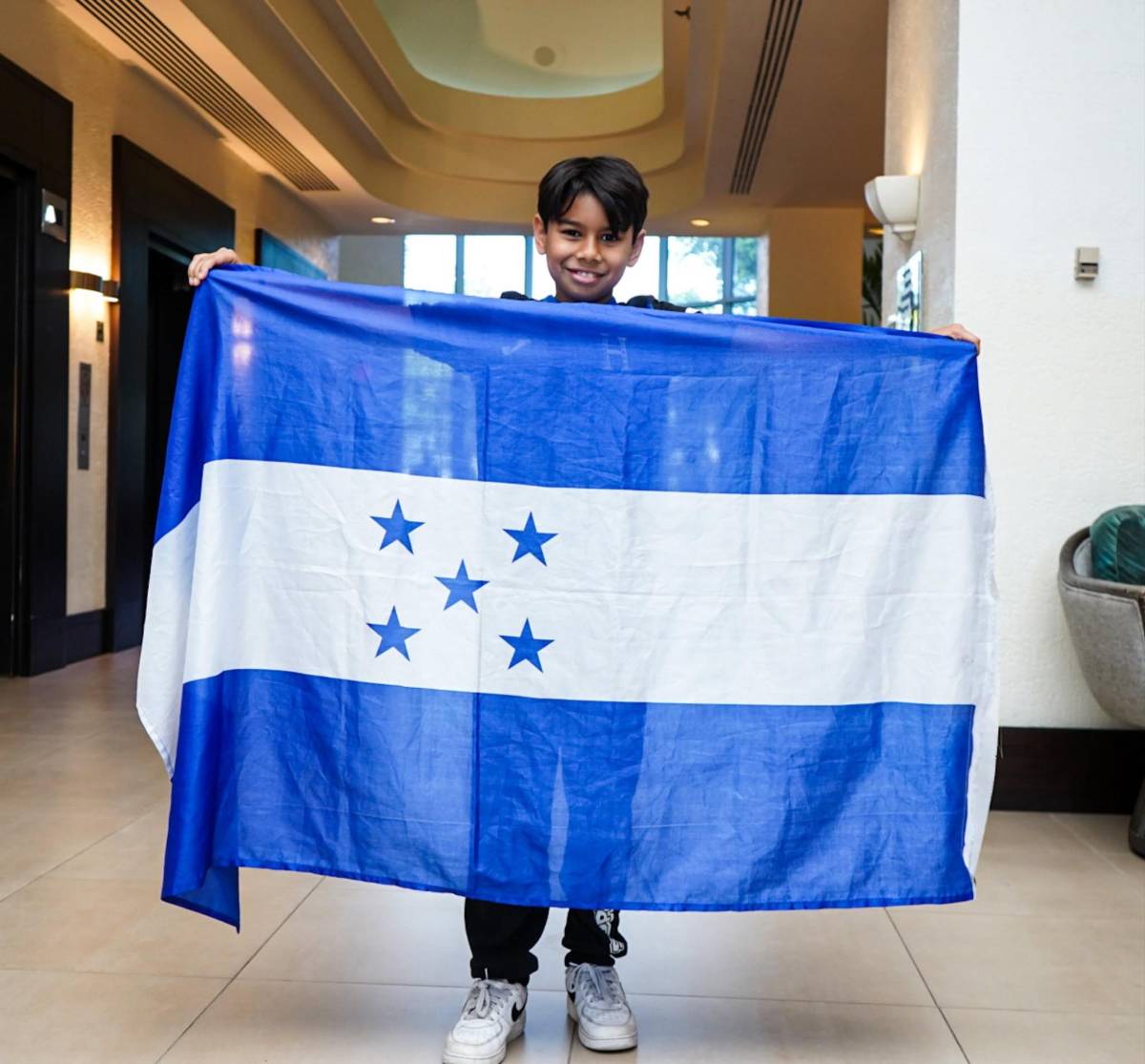 Este niño sorprendió a los seleccionados nacionales en Fort Lauderdale, los estuvo esperando hasta su llegada. Jorge Benguché le firmó la bandera catracha.