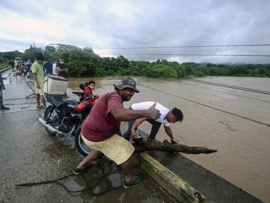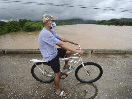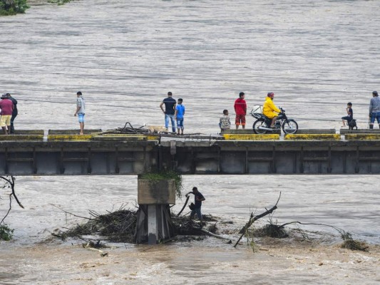 Sin ningún temor, muchos hondureños pasaron frente al fuerte caudal del río Humuya sin temor a sufrir daños. Foto: AFP 03/11/2020 - 00:005 / 16 -