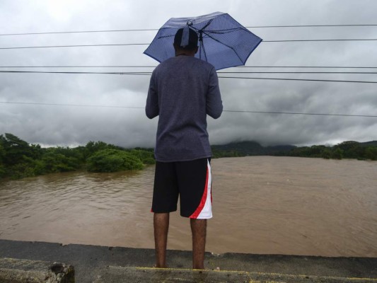 Un hondureño mira hacía el río Humuya en Santa Rita, en el departamento de Yoro, por el elevado caudal del agua provocado por las lluvias. Foto: AFP 03/11/2020 - 00:002 / 16 -