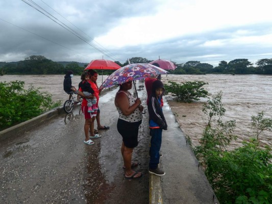 People watch the Humuya river flooding due to heavy rains caused by Eta Hurricane, in Santa Rita, Yoro department, 240 km northern Tegucigalpa, on November 3, 2020. - Honduras' authorities reported a small girl died when a house collapsed in San Pedro Sula where Eta caused flooding and forced hundreds of people to evacuate their homes. Eta is forecast to move inland over northern Nicaragua and central Honduras through Wednesday and into Thursday. (Photo by Orlando SIERRA / AFP) 03/11/2020 - 00:003 / 16 -
