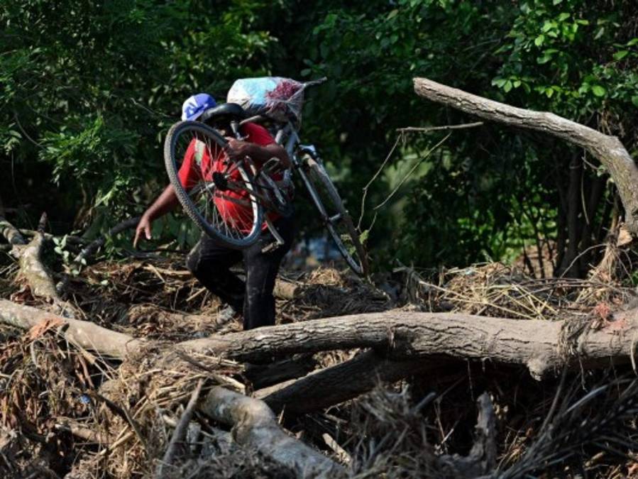 Los trabajadores de los campos bananeros se encuentran con una carretera inundada mientras evacuan el área en El Progreso, departamento de Yoro, Honduras. 15/11/2020 - 00:004 / 15 -