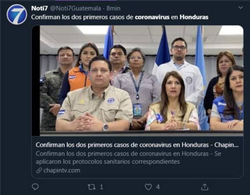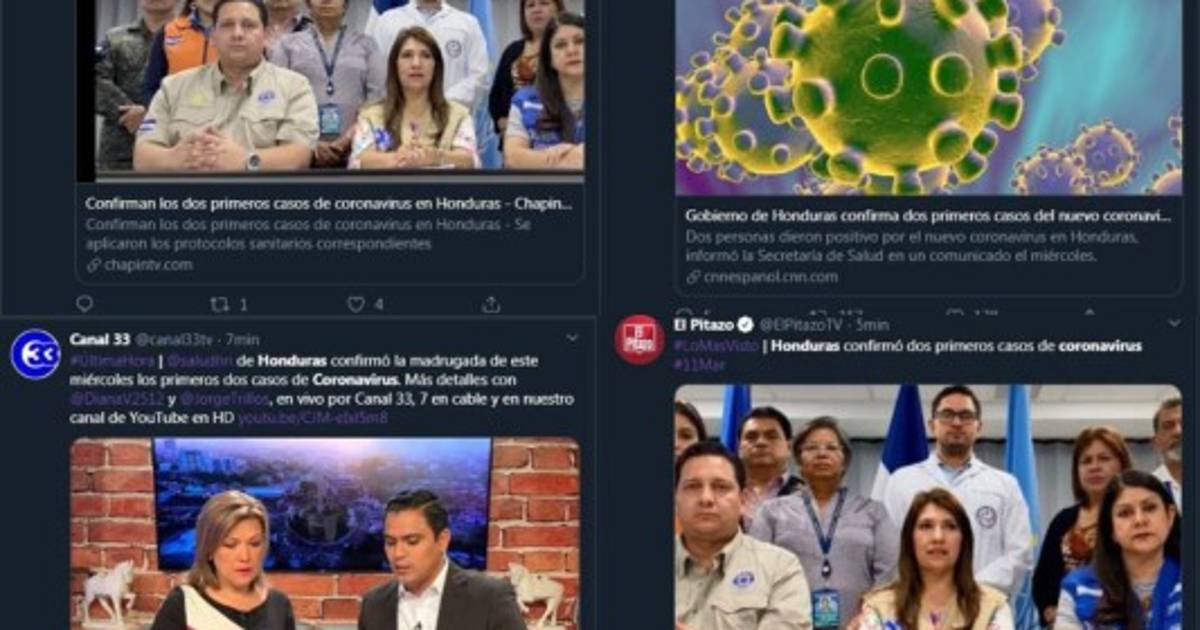 Las autoridades de la Secretaría de Salud confirmaron la madrugada de este miércoles los primeros dos casos de coronavirus en Honduras. Así lo dieron a conocer los medios internacionales. Capturas Twitter. 11/03/2020 - 00:001 / 8 -