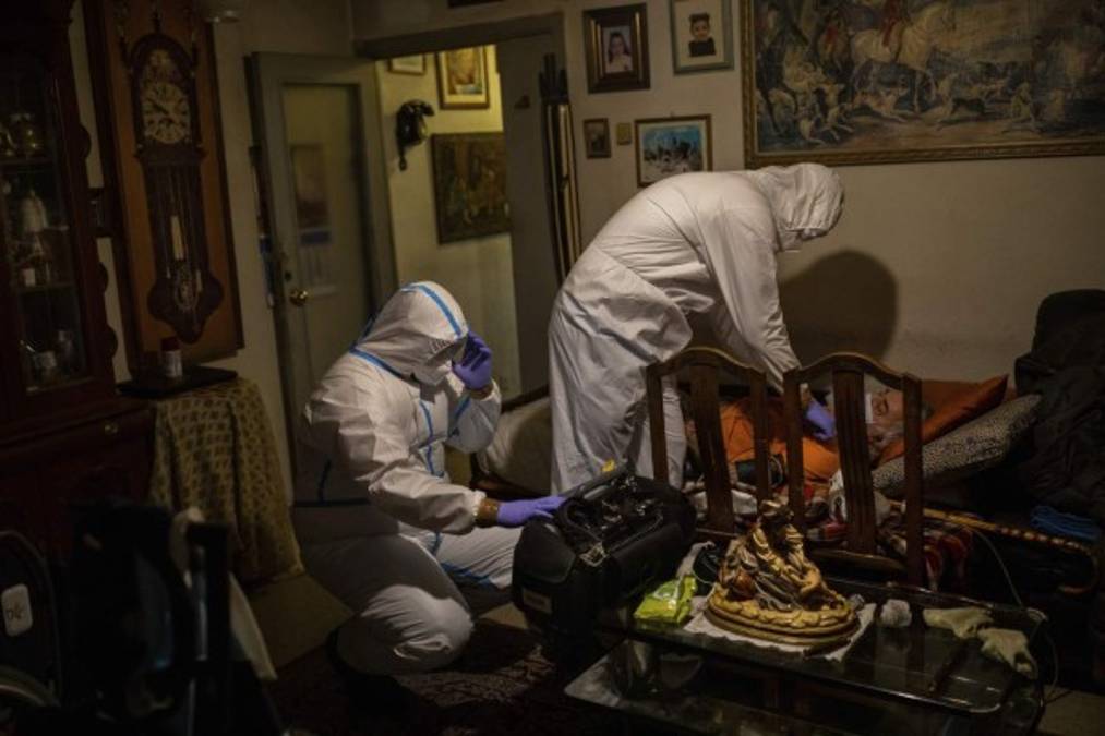 En esta imagen, tomada el 7 de mayo de 2020, Iñaki Gasteiz, médico de la unidad UVI-6 del Servicio de Urgencias de Madrid (SUMMA), reflejado en un espejo, examina en su casa a un paciente llamado Ramón, durante el brote de coronavirus, en Madrid. Tras ayudar a frenar una de las curvas de contagio más pronunciadas de Europa en la pandemia, los exhaustos trabajadores de ambulancia de Madrid temen que un rebrote de las infecciones pueda significar otro periodo de actividad frenética para los que trabajan en primera línea. (AP Foto/Bernat Armangue) 13/05/2020 - 00:0016 / 17 -