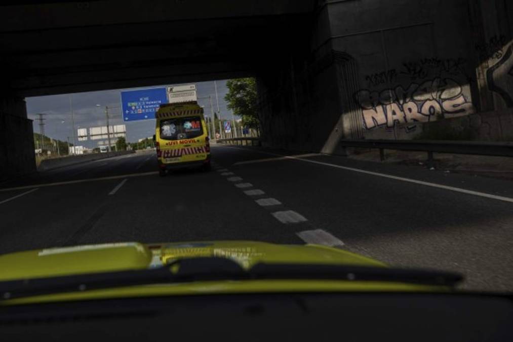 En esta imagen, tomada el 7 de mayo de 2020, miembros de la unidad UVI-6 del Servicio de Urgencias de Madrid (SUMMA) trasladan a un paciente durante el brote de coronavirus, en Madrid. Tras ayudar a frenar una de las curvas de contagio más pronunciadas de Europa en la pandemia, los exhaustos trabajadores de ambulancia de Madrid temen que un rebrote de las infecciones pueda significar otro periodo de actividad frenética para los que trabajan en primera línea. (AP Foto/Bernat Armangue) 13/05/2020 - 00:0017 / 17