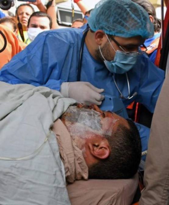 Médicos del Hospital Escuela Universitario de Tegucigalpa llevan al bombero Óscar Madrid en una camilla, previo a su traslado a la Ciudad de México para recibir tratamiento médico. Foto AFP 29/04/2018 - 00:007 / 15 -