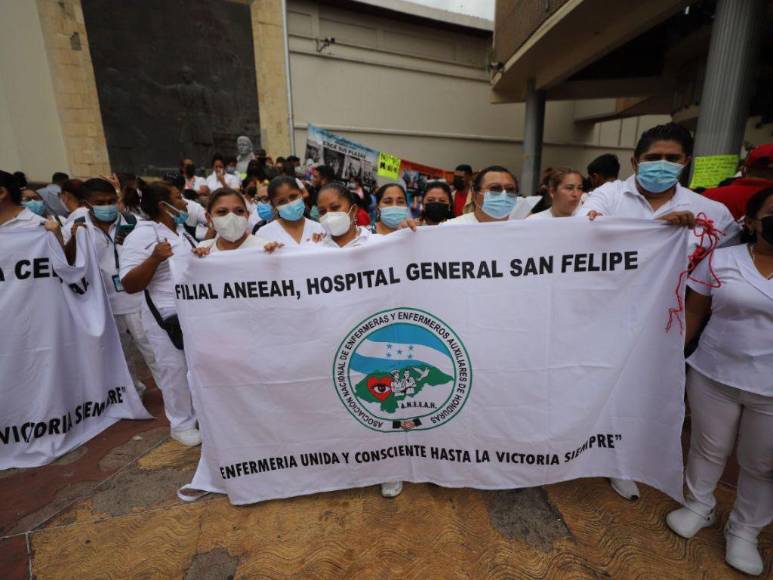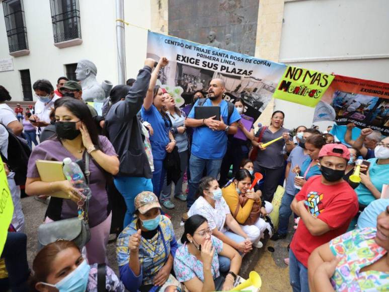 “Comayagua exige sus plazas”, “Primera línea, antes héroes, ahora desempleados” eran algunos de los mensajes que contenían los carteles de personal de enfermería en los bajos del Congreso Nacional