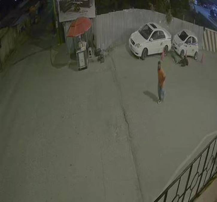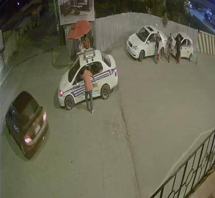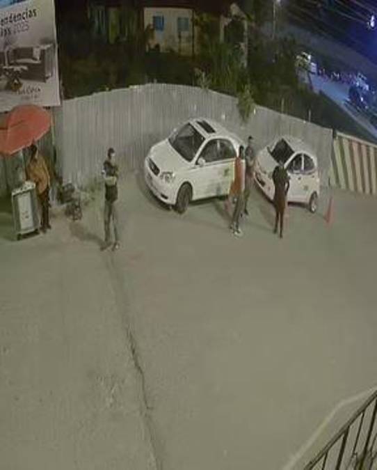 Uno de los hombres se aleja del lugar, mientras que el sospechoso intercambia una palabras con ambos taxistas solo por algunos segundos pues acto seguido saca su arma y le dispara al primero e inmediatamente después al otro.