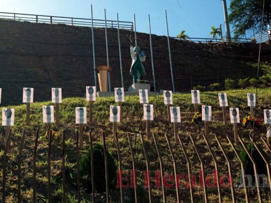 Las imágenes de los doctores y doctoras fallecidos durante la pandemia están en un predio del Colegio Medico de Honduras para recordar a cada hondureño que solo guardando la distancia, evitando aglomeraciones, portando mascarillas y lavando constantemente las manos se podrá salir de esta crisis. 10/02/2021 - 00:0017 / 17