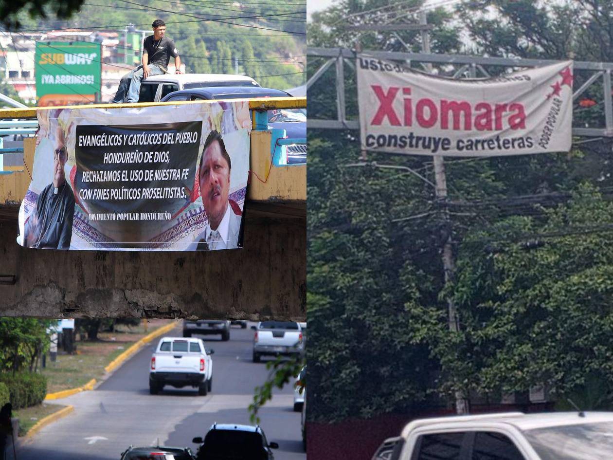 "Evangélicos y católicos del pueblo hondureño de Dios, rechazamos el uso de nuestra fe con fines políticos proselitistas", siguen los ataques en otro enorme rótulo.