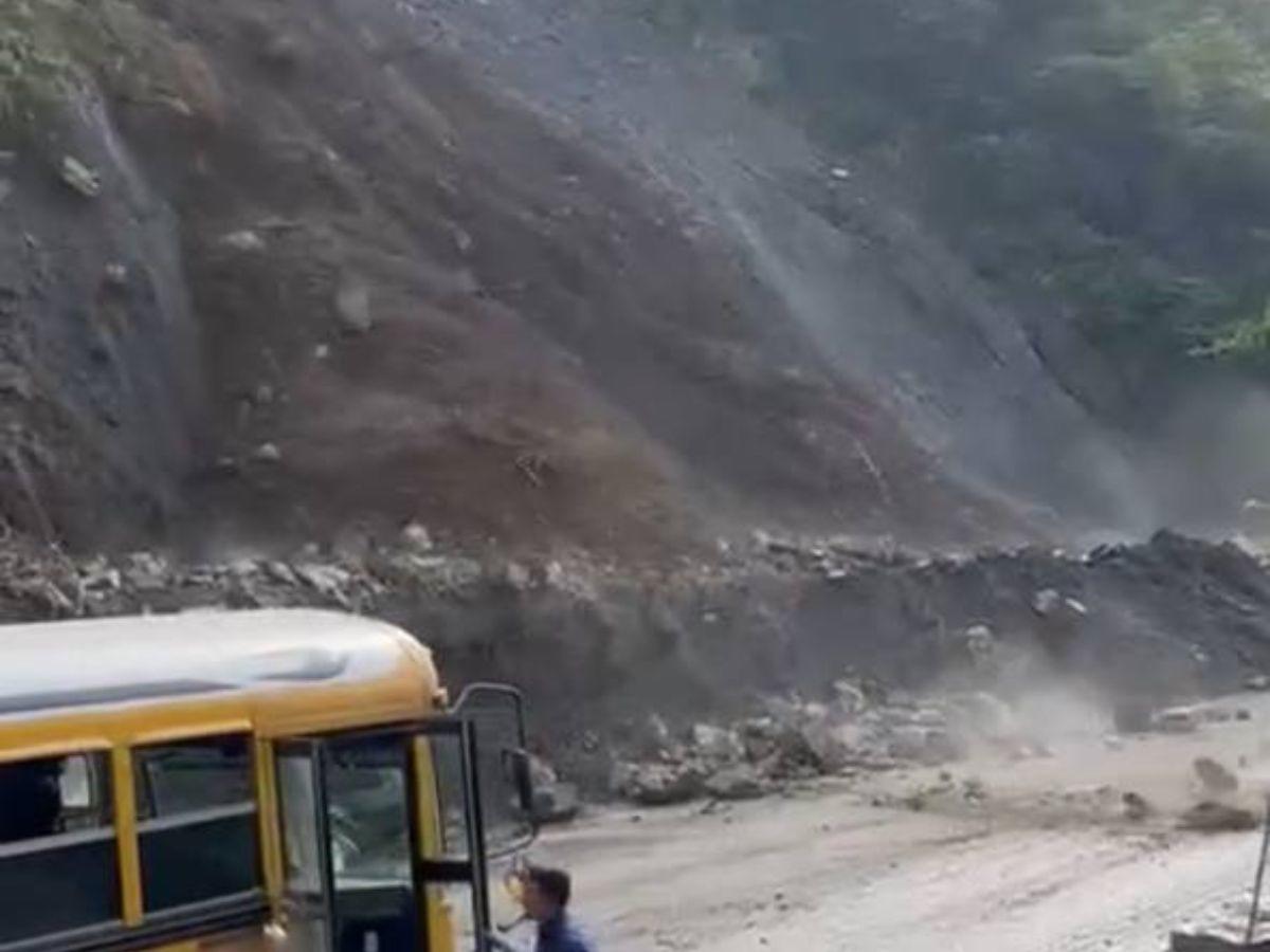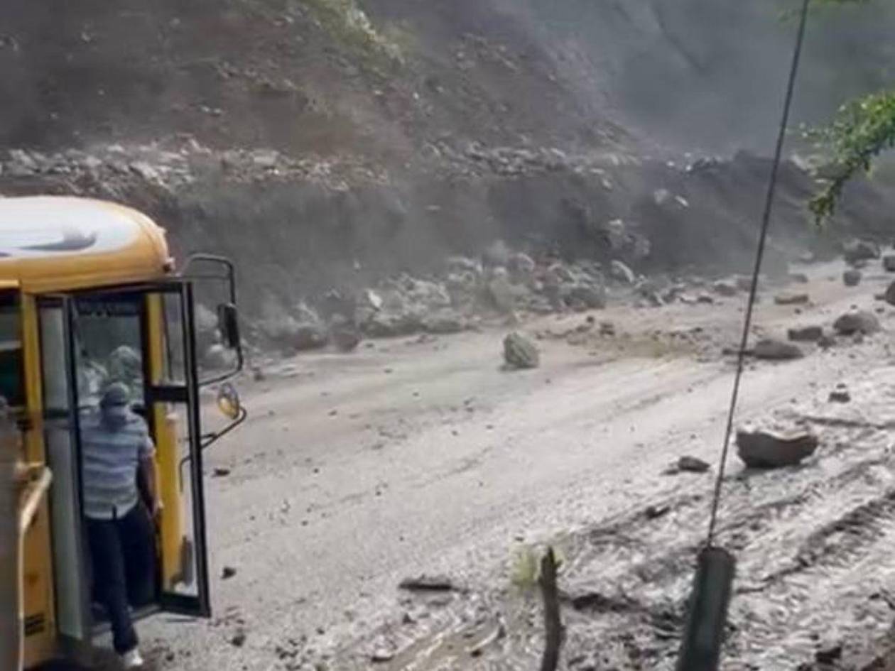 Un bus amarillo transitaba por la carretera CA-4, en el sector de la colonia Lempira de San Pedro Sula, Cortés, cuando de repente, el cerro comenzó a desprender piedras