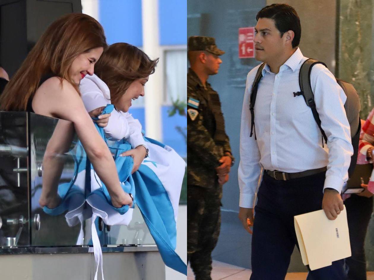 Sosteniendo la Bandera de Honduras desde los ventanales, las consejeras del CNE, Cossette López y Ana Paola Hall, salieron a dar las gracias por el apoyo tras comparecer ante el MP, junto a Marlon Ochoa