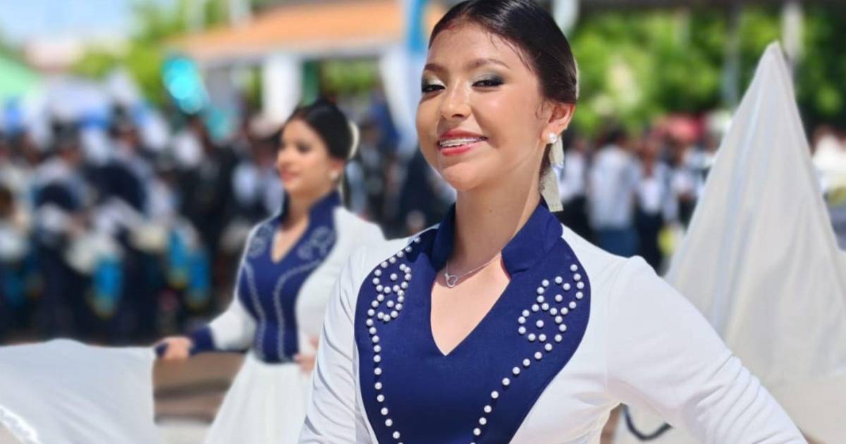 Con un elegante atuendo azul y blanco, bastón decorado y diadema blanca, las palillonas brillaron en su espectáculo durante los desfiles patrios.