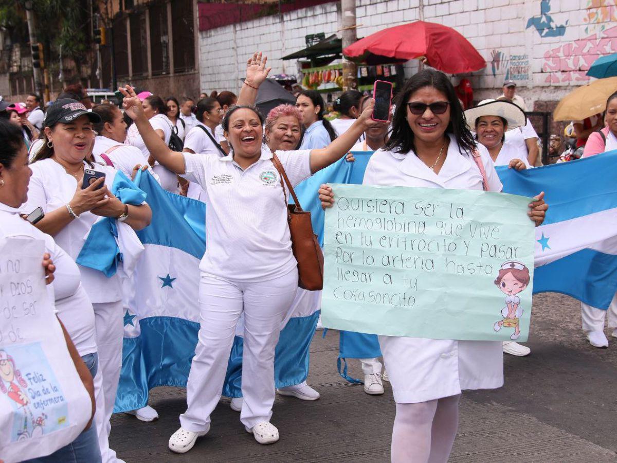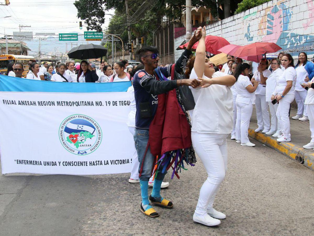 A pocos metros, también protestaban las enfermeras del Hospital Escuela, exigiendo el cumplimiento de sus derechos: “Señora ministra, enfermeros jubilados del Hospital Escuela, exigimos respeto y justicia”, se leía en una pancarta.
