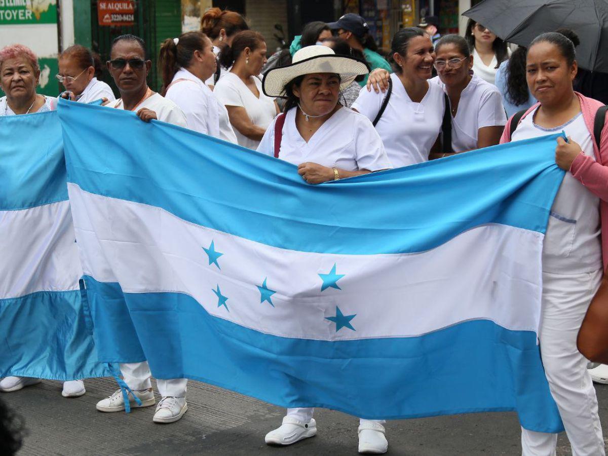 Con pancartas en mano y banderas de Honduras, las enfermeras auxiliares exigen un trato digno y una respuesta inmediata de las autoridades ante los abusos laborales que denuncian.