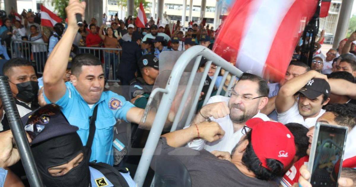 Golpes, toletazos y personas heridas dejó un violento zafarrancho protagonizado por la guardia del Congreso Nacional y la Policía Nacional, quienes agredieron a los simpatizantes y a los líderes del Partido Liberal.