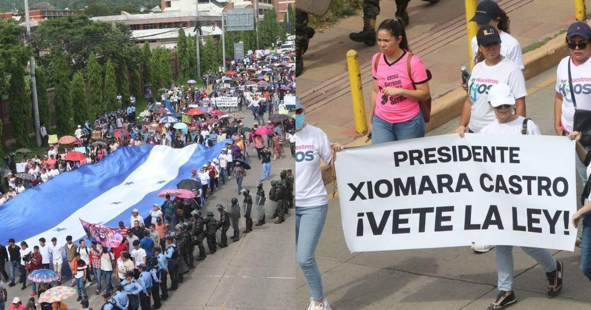 Los manifestantes reclaman a la presidenta Xiomara Castro vetar la polémica ley que fue aprobada por el Congreso Nacional hace algunos meses.
